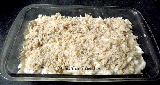 • Sprinkle the buttered bread crumbs over the top. I have used brown bread slices, hence the colour.