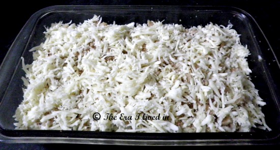 • Sprinkle the remaining cheddar and mozzarella cheese over the bread crumb layer.